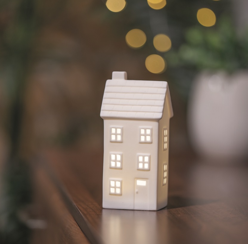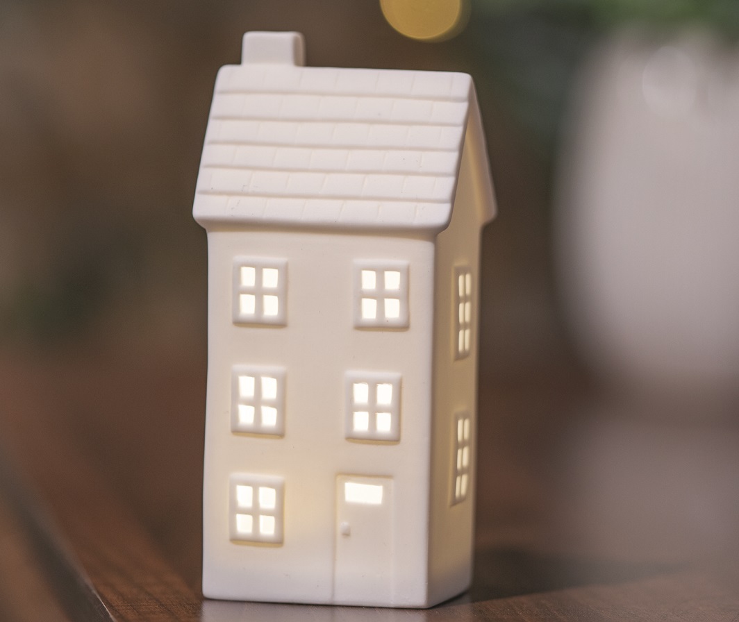 Keramický domček LED svietiaci, 1 LED, teplá biela, 7,7 × 16,3 × 6 cm