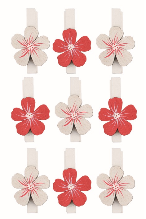 Kvietka červená a biela drevená 2,5 x 2,5 x 0,3 cm na kolíčku, 9 ks v sáčku