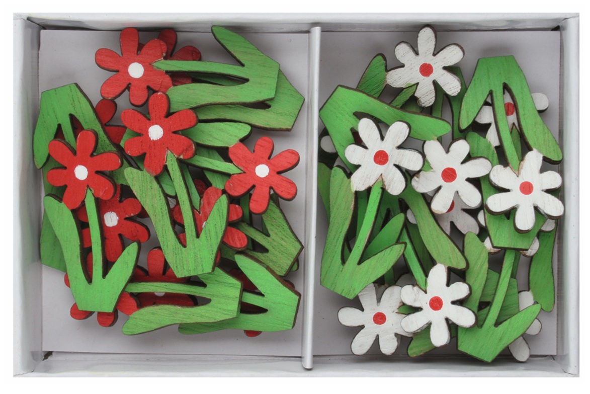 Kvietky drevené biele a červené 2 x 3,5 x 0,3 cm s lepíkom, 24 ks v krabičke