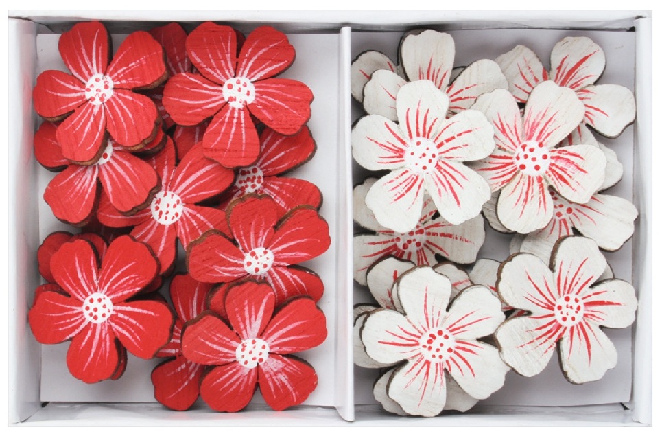 Kvietky drevené červené a biele 2,5 x 2,5 x 0,3 cm s lepíkom, 24 ks v krabičke