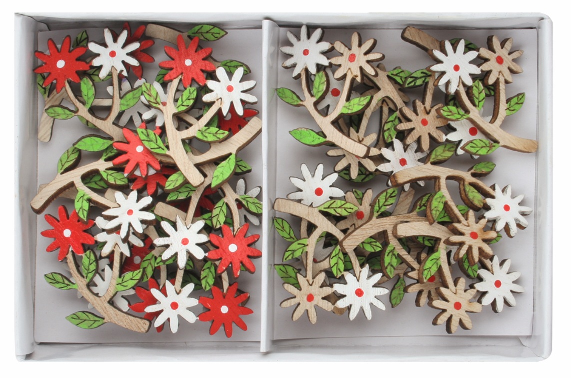 Kvietky drevené červené a biele 2,5 x 3,5 x 0,3 cm s lepíkom, 24 ks v krabičke