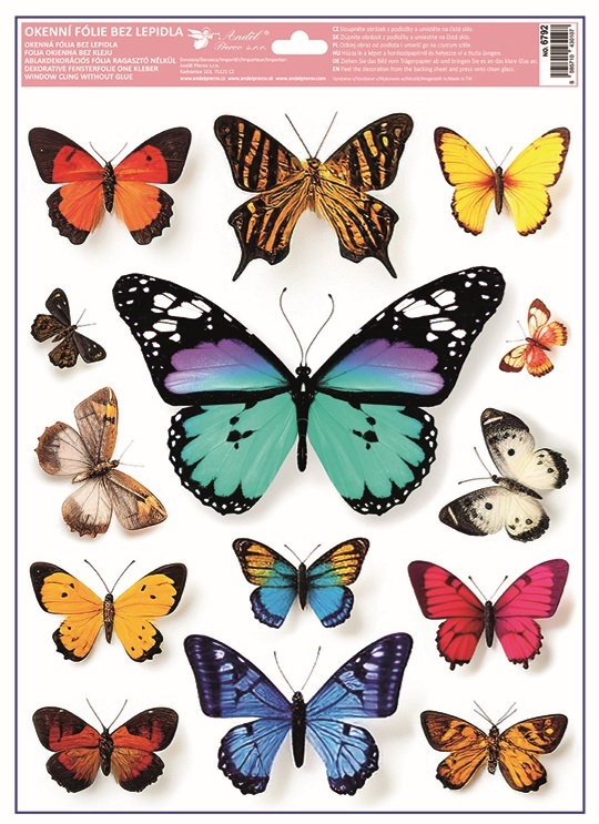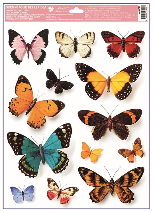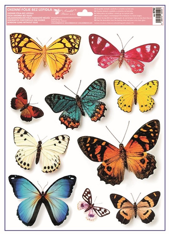 Táto dekoračná okenná fólia s motívom farebných motýľov s rozmerom 30 × 42 cm rozžiari okná jemným leskom a živými farbami. Priľne elektrostaticky – bez lepidla, nezanecháva žiadne stopy, ľahko sa aplikuje a je opakovane použiteľná.