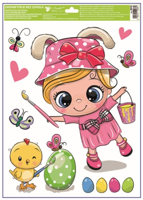 Motív plný veľkonočnej radosti, farebných vajíčok a roztomilých ilustrácií krásne oživí okná, vitríny aj zrkadlá a vytvorí veselú sviatočnú výzdobu. Jemný trbliet glitrov dodá dekorácii atraktívny detail, ktorý na svetle krásne vynikne.
