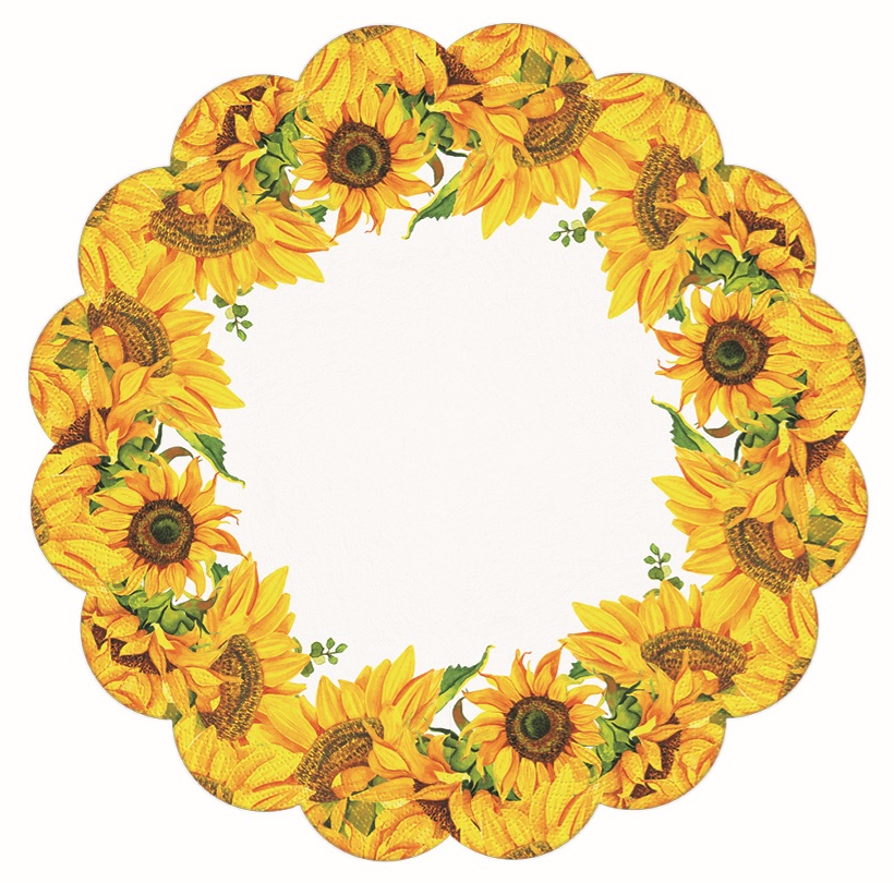 Elegantné okrúhle papierové obrúsky s dekoratívnym motívom rozkvitnutých slnečníc sú štýlovým a zároveň praktickým doplnkom pre slávnostné aj každodenné stolovanie. Motív slnečníc prináša na prestretý stôl sviežu, veselú a prirodzenú atmosféru, ktorá je ideálna pre jarné oslavy, svadby, záhradné párty alebo rodinné hostiny. Neobvyklý okrúhly tvar s ozdobným okrajom pôsobí veľmi dekoratívne a obrúsky je možné využiť nielen pri servírovaní jedál a nápojov, ale aj ako efektnú dekoráciu pod taniere, svietniky či iné stolové doplnky. Trojvrstvové prevedenie zaručuje pevnosť, dobrú savosť a pohodlné používanie. Priemer 32 cm ponúka univerzálne využitie pri rôznych typoch stolovania.