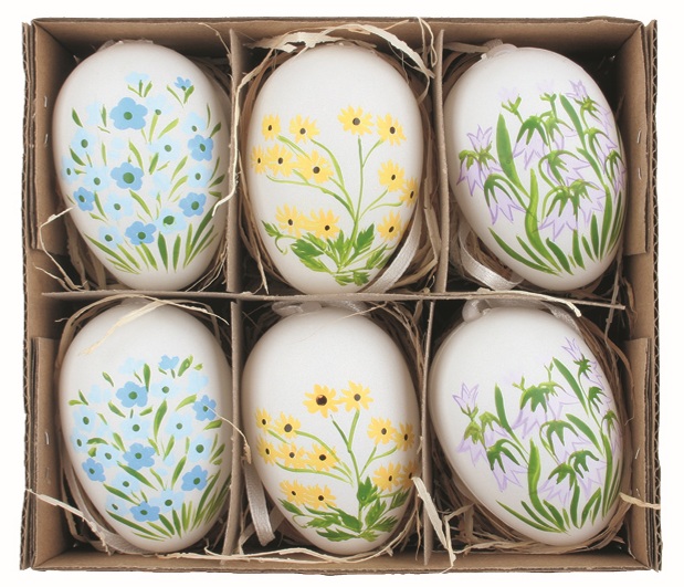 Sada veľkonočných plastových vajec maľované Kvieti 6 cm na zavesenie, 6 ks v krabičke