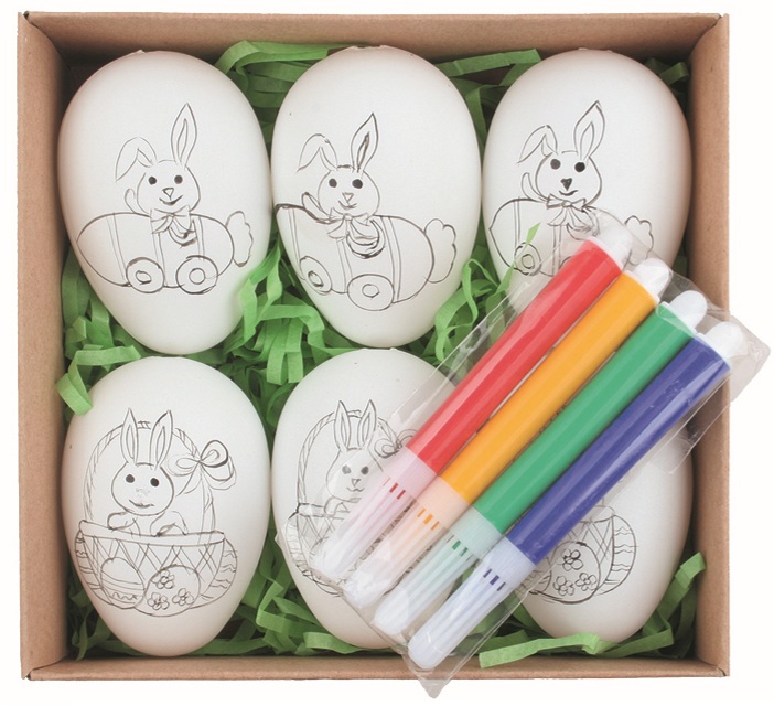 Sada veľkonočných plastových vajec Zajac Na domaľovanie 6 cm na zavesenie, 6 ks vajec + 4 ks fixiek