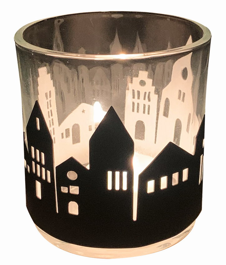 Svietnik sklenený s bielymi kovovými domčekmi 7 x 8 x 7 cm
