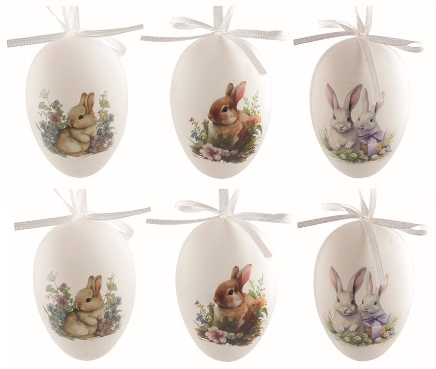 Veľkonočné vajcia plastové maľovanie Zajačikovia 6 cm na zavesenie, 6 ks v sáčku