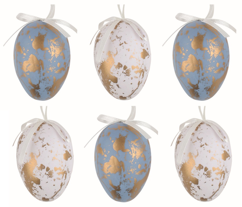 Veľkonočné vajcia plastové so zlatým dekorom 6 cm na zavesenie, 6 ks v sáčku