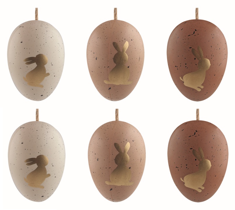 Veľkonočné vajcia plastové Zlatí zajačikovia na hnedom 6 cm na zavesenie, 6 ks v sáčku