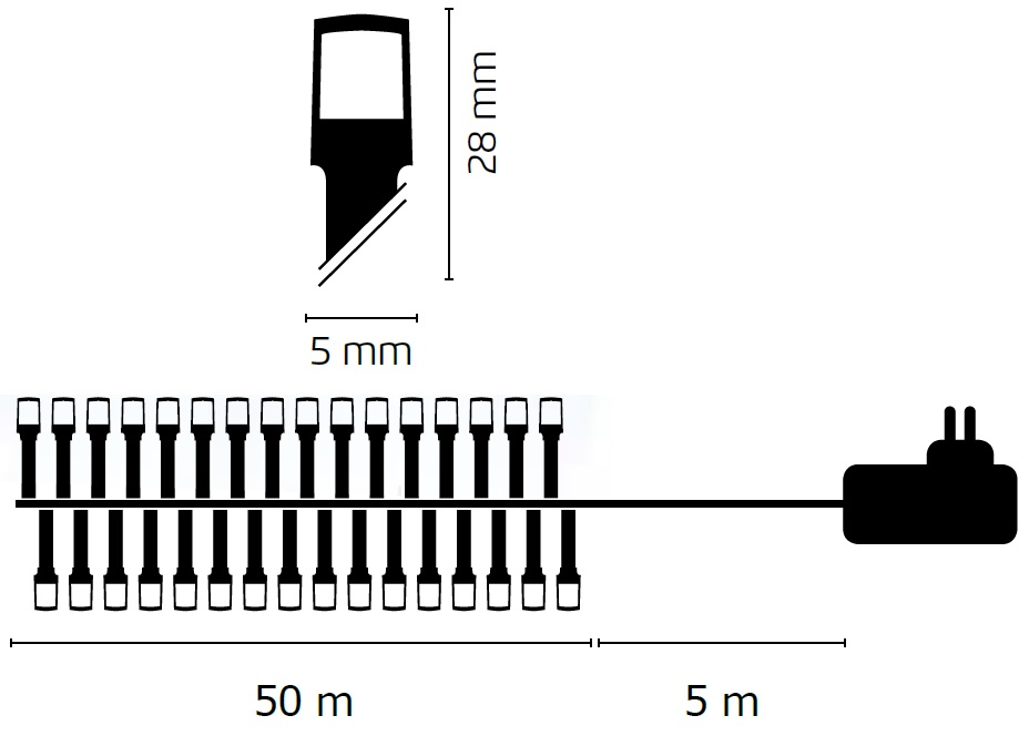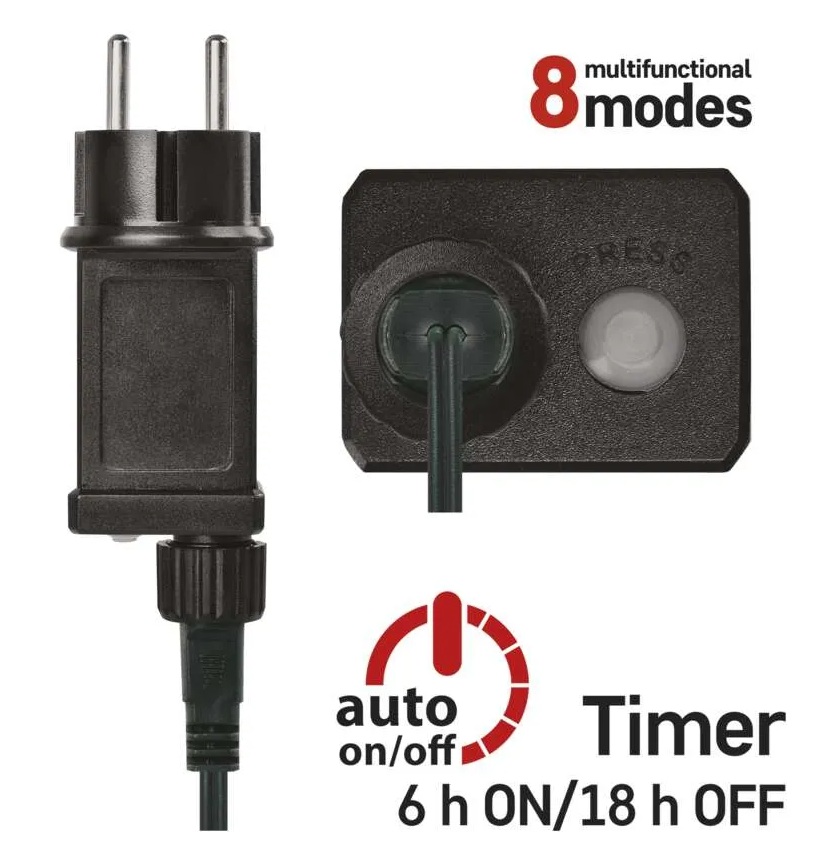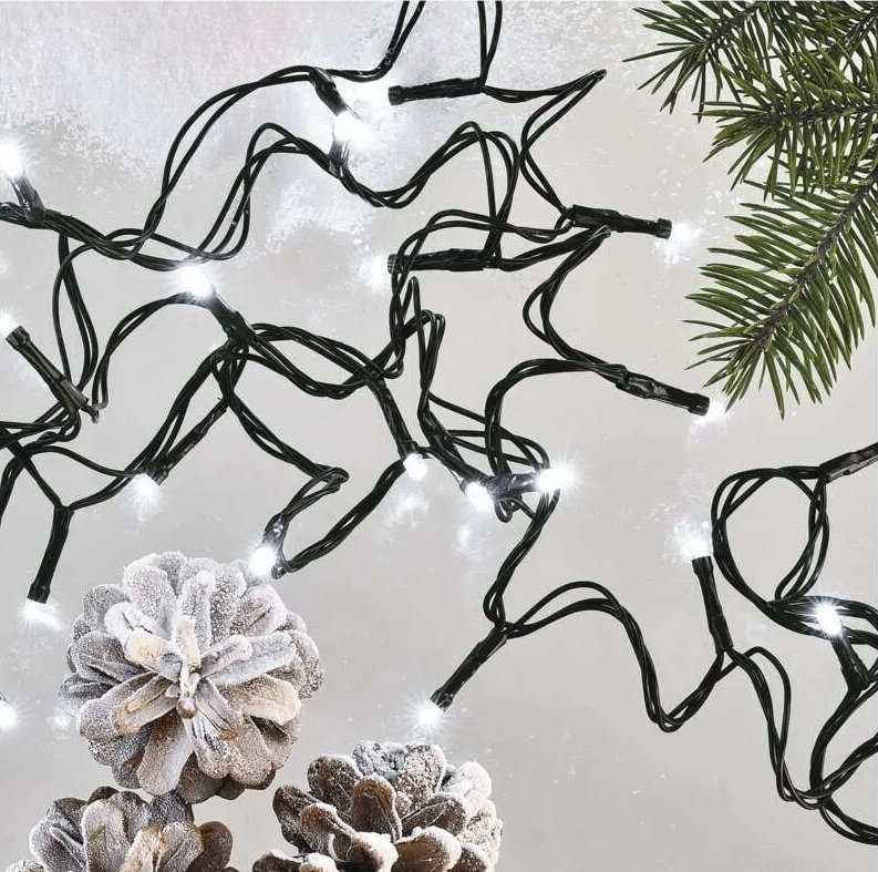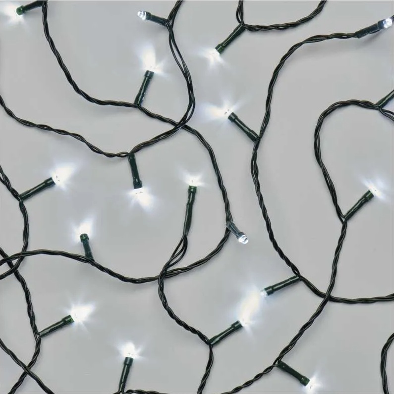 Svetelná reťaz s dĺžkou 50 m s 500 jasnými LED vo farbe studená biela krásne zvýrazní stromček aj výzdobu domu. Vďaka krytiu IP44 je vhodný pre vonkajšie aj vnútorné použitie. Ponúka 8 svetelných módov (multifunkcia) a praktický časovač na pohodlné automatické svietenie. Zelený kábel splynie s vetvami a 5 m prívod uľahčí napojenie do zásuvky.